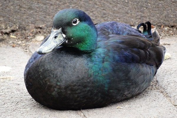 Le canard Cayuga est traditionnellement noir, du corps au bec en passant par les pattes. Sous une lumière vive, son plumage prend des reflets métalliques verts ou bleus. L'oiseau brille littéralement au soleil, ce qui le rend encore plus majestueux.