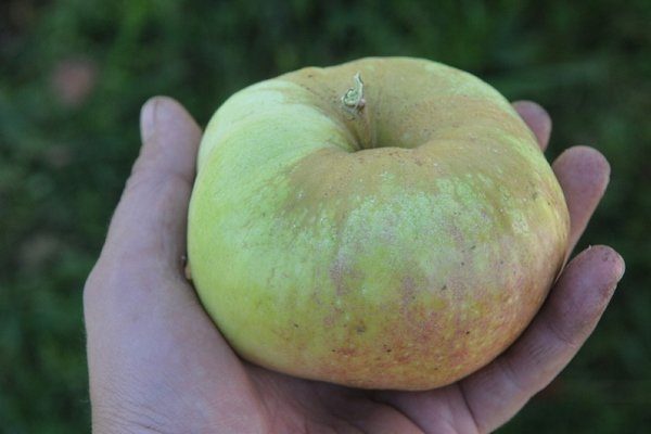 Ces pommes se reconnaissent facilement à leur forme aplatie et à leur grande taille : leur poids moyen est d’environ 160 g, certains spécimens atteignant 400 g. Leur surface est lisse, sans aspérités, et largement côtelée. À la récolte, elles sont vert clair ; à maturité, elles jaunissent. Les faces exposées au soleil se parent d’une teinte rosée brillante. Leur peau rugueuse leur confère d’excellentes propriétés de transport.