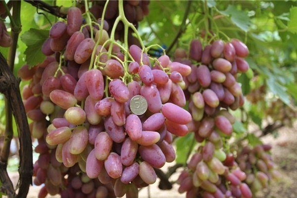 - Groupes. Les raisins forment des grappes cylindriques-coniques, lourdes et de densité moyenne. Avec des soins appropriés et des conditions climatiques favorables, elles peuvent atteindre un poids de 2 à 3 kg. Le poids moyen d'une grappe varie de 800 g à 1 kg. Les raisins ne sont pas sujets à la formation de pois et les baies des grappes ne se déforment pas.